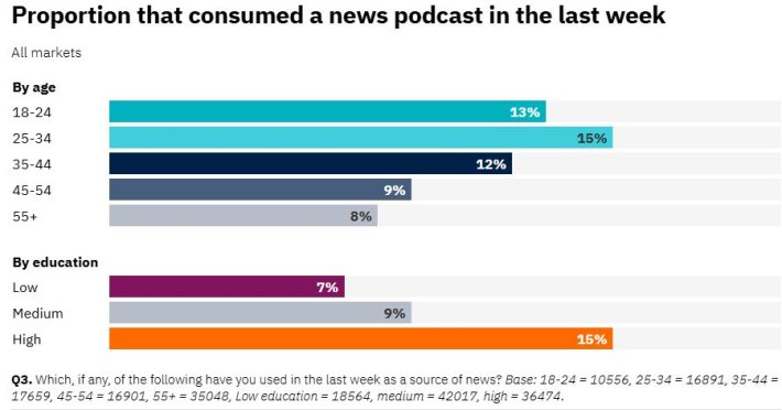 Podcastingul de știri are succes în rândul unui public mai tânăr și mai bine educat, cu cei mai mulți consumatori în Statele Unite. Piețele de podcasturi din nordul Europei rămân dominate de radiodifuzorii publici sau de marile companii media tradiționale și au fost mai lente în adoptarea versiunilor video.