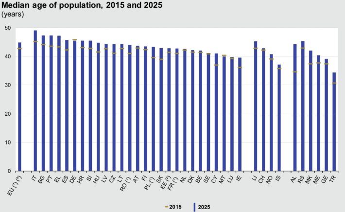 Vârsta mediană împarte în mod egal populația unui stat sau a unei regiuni, fiind un barometru al îmbătrânirii demografice. Raportul Eurostat arată că la 1 ianuarie 2025 vârsta mediană a UE era de 44,9 ani, crescând cu 2,1 ani în ultimul deceniu. Conform raportului Eurostat, vârsta mediană indică Italia ca fiind cea mai îmbătrânită țară din UE, iar Irlanda ca fiind țara cu cel mai mare număr de tineri. În ultimii 10 ani, cea mai mare creștere a vârstei mediane a fost înregistrată în Slovacia și Cipru, iar scăderi s-au înregistrat în Germania și Malta. Între 2024 și 2025, vârsta mediană a crescut în 25 de țări UE, în timp ce a rămas constantă în Germania și Danemarca.