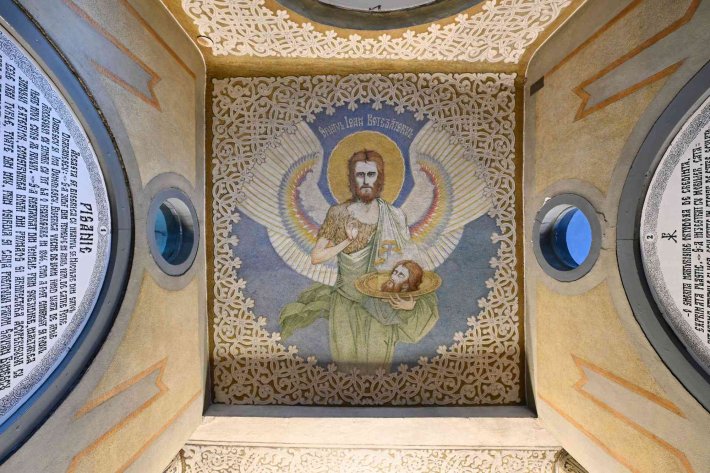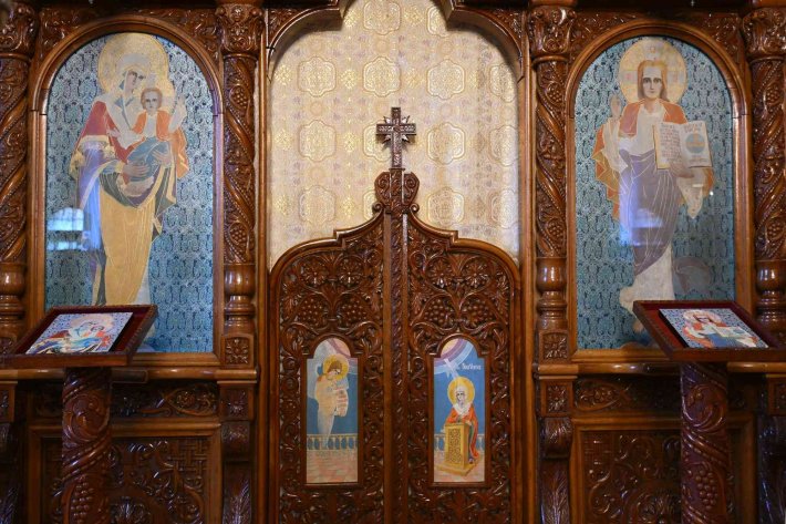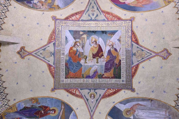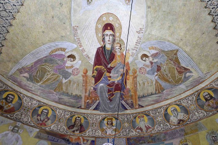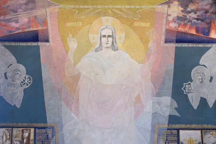 Intrarea în lumea din „oglindă” se face printr-o ușă îngustă, intenționat zidită așa ca să știi, să simți că aici te naști din nou din durere, cu durere. Lume multă în biserică, dar și mai multă pe pereți. Glisează aerul, timpul, istoria, auzi cum crește Pruncul Iisus, cum mestecă ucenicii la Cină trupul împâinit al Domnului și cum înghit sângele Lui în vin. Cum își pregătesc călăii piroanele să-l țintuiască pe Petru, care îi imploră să-l bată pe cruce cu capul în jos. Distingi colțuri de Rai și vezi Duhul cum îi îmbracă pe apostoli, lumina pe care îngerii o întind peste întunericul lumii, auzi glasul ca un trăsnet al Sfântului Arsenie bubuindu-ți în timpane: „Să nu credeți că veți intra după moarte în împărăția în care nu ați trăit pe pământ!”. Apoi te oprești. Te zvârcolești schimonosit, asuzi, te faci călcătură, te faci lacrimă de sare, te faci pământ, fugi pentru a te întoarce, căci nu există scăpare, căci există salvare, chemare există și răspuns la chemare. „Veniți la Mine!”, strigă Mântuitorul spre rigiditatea umană contemporană, din trupul Său diafan, translucid, înviat din mormântul din care tocmai se înalță, prin Sfânta Masă, cu picioarele adâncite parcă în apa Iordanului. Strigăt ca o rugă, ca un plâns, ca un cutremur.