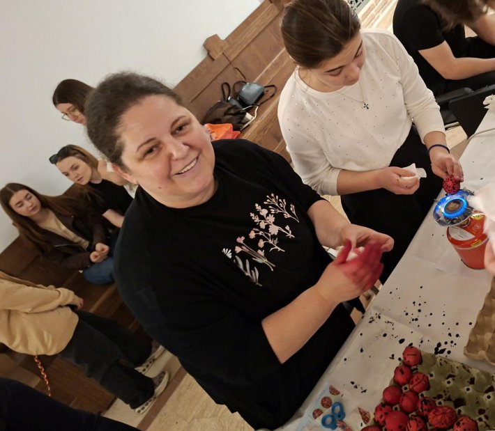 Chiar dacă văzuse la bunici cum se încondeiază ouăle, doamna preoteasă şi-a însuşit pe deplin meşteşugul în atelierul maicilor de la Mănăstirea Miclăuşeni (judeţul Iaşi). Tot acolo a învăţat că trebuie să faci cumva să dai înapoi din ceea ce primeşti, astfel că a prins drag de ideea de a-l transmite copiilor şi tinerilor.