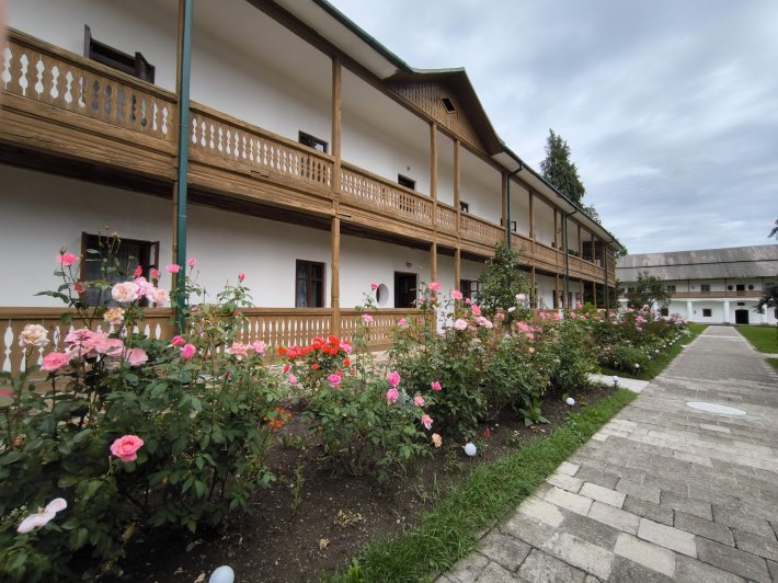 Iscusit înălțată într-un perimetru delimitat de Obcina Plaiului Bătrân, Surducu și Dealu Mare, mănăstirea are alura unei cetăți. Zidurile de apărare, construite încă din vremea ctitorului Alexandru Lăpușneanu, au conservat o stare de calm care vine parcă de dincolo de orice dimensiune perceptibilă. Puține zgomote răzbesc înăuntru. Dispar repede, pierzându-se într-un fundal în care încape tot restul lumii. Îndată începe domnia liniștii, ca o treaptă de pregătire - te împresoară, te curăță, te pune în armonie cu propriul sine. Extras aproape terapeutic din vrajba lumescului, te poți înfrupta din lumina care a făcut din Slatina o veritabilă academie a spiritului. „Așa a fost Slatina mereu, cu pace și cu liniște multă. Cei care vin și-o descoperă n-o mai uită”, îmi spune maica Serafima Gherasim. E stareță la Slatina din octombrie 2024, dar în obștea mănăstirii a intrat acum un deceniu. E din Humulești de loc și când a venit prima dată aici a și rămas. „Aveam 25 de ani. Am venit la 20 decembrie. Toată lumea pleca acasă de Crăciun și am simțit că am venit și eu acasă”, își amintește ea.