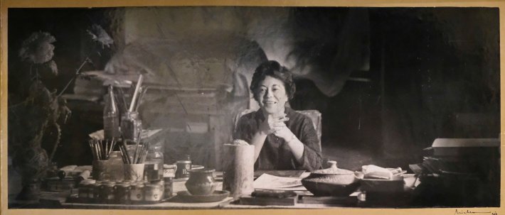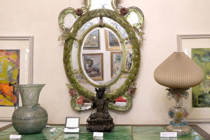 Totul merită admirat aici, inclusiv o sobă de Boemia şi un candelabru de Murano. Gazda noastră ştie totul despre toate exponatele şi ne-ar plimba o zi întreagă prin casă. Timp s-ar găsi, dar spațiul articolului e limitat, așa că mai spun aici doar două cuvinte despre atelierul Ligiei Macovei, cu volumele comemorative dedicate poeziilor lui Mihai Eminescu și Tudor Arghezi, dar și cu o masă de origine iraniană, a cărei tavă este inscripționată cu versete din Coran, iar picioarele sunt din lemn sculptat, cu sidef. Atelierul a fost creat din două încăperi, prin dispariția unei uși și a unui glasvand.