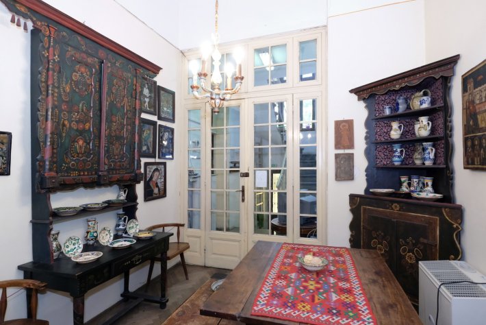 Am trecut apoi în camera cu obiecte de artă populară, unde am observat mai întâi o poliță, creație a populației săsești, un set de farfurii, tot de origine germană, un dulap românesc datat 1826, o masă a cărei tăblie glisează, având dedesubt un sertar unde se puneau tacâmurile și vesela, un scrin imitând modelul Biedermeier, datat 1813, creația unui meșter popular român.