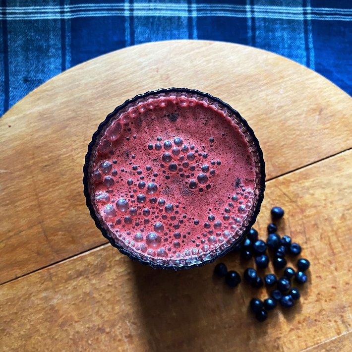 Ingrediente: 1 cană afine; ¾ cană lapte de soia sau de mazăre; 10 migdale; 1 linguriță semințe de in măcinate; 1 curmală; 1 linguriță semințe de cânepă. |