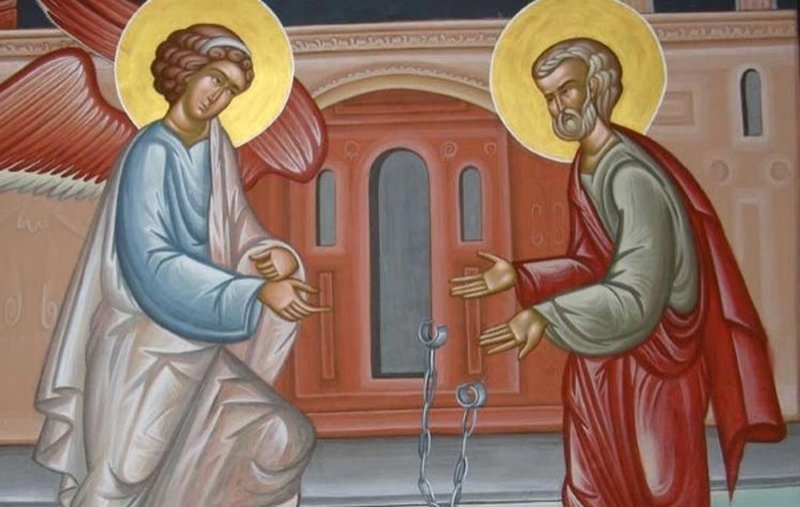 În zilele acelea, gândindu-se Petru la cele petrecute cu el, a venit la casa Mariei, mama lui Ioan, cel numit și Marcu, unde erau adunați mulți și se rugau. Și, bătând Petru la ușa de la poartă, o slujnică, cu numele Rodi, s-a dus să asculte. Și, recunoscând glasul lui Petru, de bucurie nu a deschis ușa, ci, alergând înăuntru, a spus că Petru stă înaintea porții. Iar ei au zis către ea: Ai înnebunit! Dar ea stăruia că este așa. Iar ei ziceau: Este îngerul lui! Dar Petru bătea mereu în poartă. Și, deschizându-i, l-au văzut și au rămas uimiți. Și, făcându-le semn cu mâna să tacă, le-a istorisit cum l-a scos Domnul pe el din temniță. Și a zis: Vestiți acestea lui Iacov și fraților! Și, ieșind, s-a dus în alt loc.