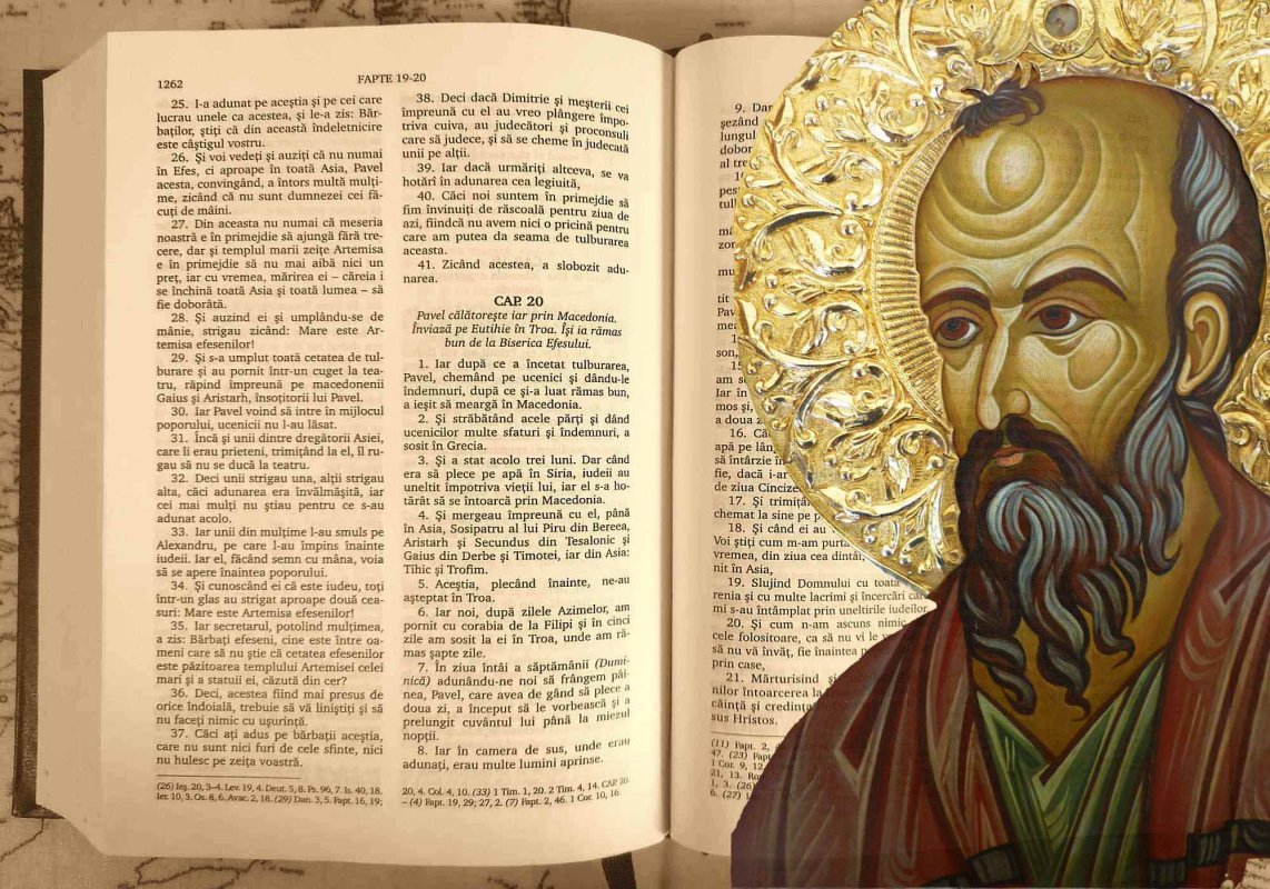 În zilele acelea, Pavel hotărâse să treacă pe apă pe lângă Efes, ca să nu i se întâmple să întârzie în Asia, pentru că se grăbea să fie, dacă i-ar fi cu putință, la Ierusalim, de ziua Cincizecimii. Și, trimițând din Milet la Efes, a chemat la sine pe preoții Bisericii. Și când ei au venit la el, le-a zis: Luați aminte de voi înșivă și de toată turma întru care Duhul Sfânt v-a pus pe voi episcopi, ca să păstoriți Biserica lui Dumnezeu, pe care a câștigat-o cu însuși sângele Său. Căci eu știu aceasta că, după plecarea mea, vor intra între voi lupi îngrozitori, care nu vor cruța turma. Și dintre voi înșivă se vor ridica bărbați grăind învățături răstălmăcite, ca să tragă pe ucenici după ei. Drept aceea, privegheați, aducându-vă aminte că, timp de trei ani, n-am încetat, noaptea și ziua, să vă îndemn cu lacrimi pe fiecare dintre voi. Și acum vă încredințez lui Dumnezeu și cuvântului harului Său, cel ce poate să vă zidească și să vă dea moștenire între toți cei sfințiți. Argint, aur, sau haină n-am poftit de la nimeni; voi înșivă știți că mâinile acestea au lucrat pentru trebuințele mele și ale celor ce erau cu mine. Toate vi le-am arătat, căci ostenindu-vă astfel, trebuie să ajutați pe cei slabi și să vă aduceți aminte de cuvintele Domnului Iisus, căci El a zis: Mai fericit este a da decât a lua. Și, după ce a spus acestea, plecându-și genunchii, s-a rugat împreună cu ei toți.
