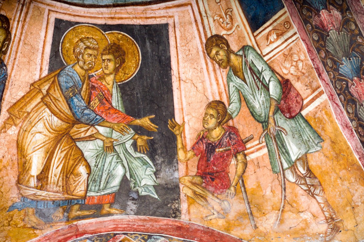 În zilele acelea, Petru și Ioan se suiau la templu pentru rugăciunea din ceasul al nouălea. Și era un bărbat, olog din pântecele mamei sale, pe care-l aduceau și-l puneau în fiecare zi la poarta templului, zisă Poarta Frumoasă, ca să ceară milostenie de la cei care intrau în templu. Acesta, văzând că Petru și Ioan aveau să intre în templu, le-a cerut milostenie. Iar Petru, căutând spre el, împreună cu Ioan, a zis: Privește la noi! Iar acesta se uita la ei cu luare-aminte, așteptând să primească ceva de la ei. Iar Petru a zis: Argint și aur nu am; dar ce am, aceea îți dau. În numele lui Iisus Hristos Nazarineanul, scoală-te și umblă! Și, apucându-l de mâna dreaptă, l-a ridicat și îndată gleznele și tălpile picioarelor lui s-au întărit. Și, sărind, a stat în picioare și umbla și a intrat cu ei în templu, umblând și sărind și lăudând pe Dumnezeu.