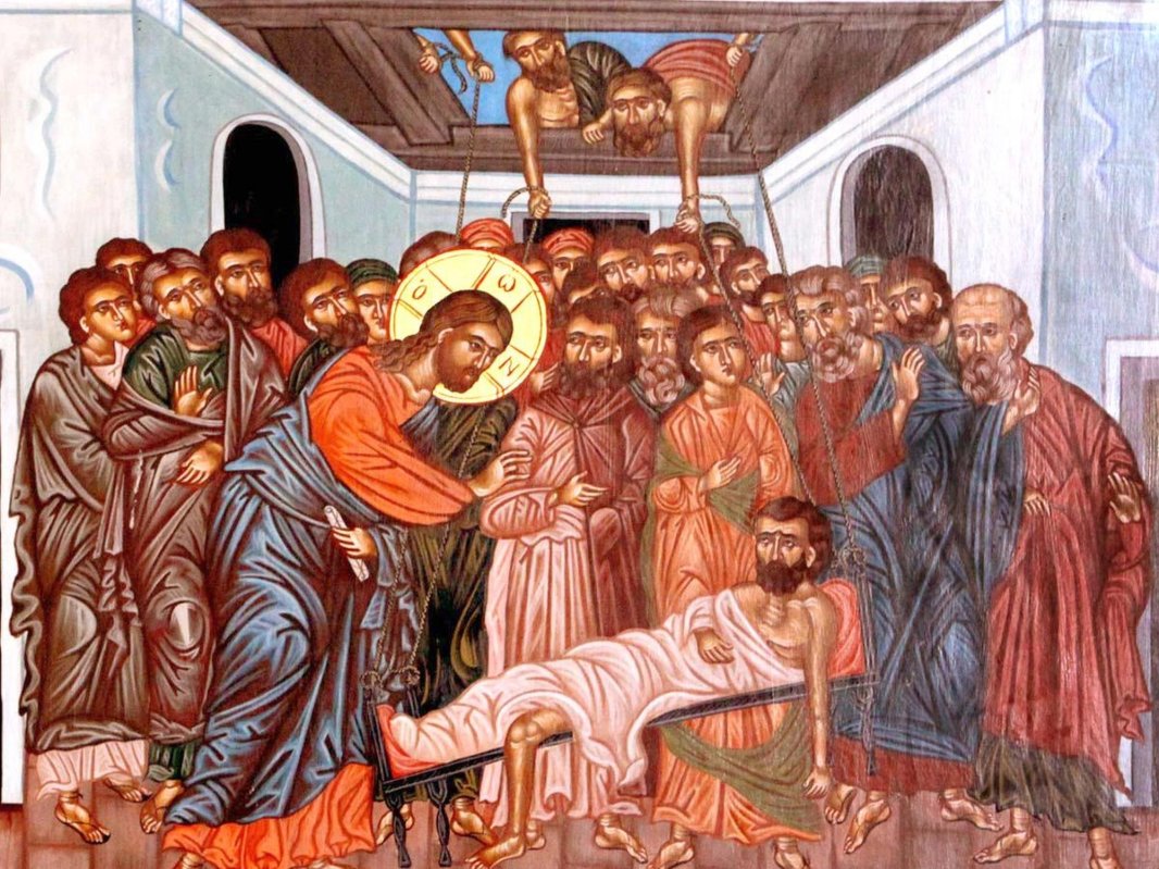 În Evanghelia de la Marcu 2, 1-12 ni se spune că au venit patru bărbați cu un bolnav pe o năsălie sau targă sau ceva similar și, neputând să intre în casă, au coborât pe bolnav prin acoperișul casei. De fapt, era acel umbrar unde oamenii stăteau din cauza căldurii și nu neapărat acoperișul unei case. Dincolo de aceste elemente auxiliare apare un lucru important: unitatea sau comuniunea iubirii. Hristos le vede „credința lor” (Mc. 2, 5), nu credința slăbănogului, arătând că în suferință Dumnezeu așteaptă iubirea comunitară. Mântuirea are o dimensiune comunitară. Vorba părinților duhovnicești: Cazi singur, dar te ridici împreună cu ceilalți. Sfântul Ioan Gură de Aur spune în acest sens: „Domnul nu caută numai credința celui bolnav, ci și a celor care îl duc; căci credința lor a fost pricina de mântuire pentru paralitic”. Sfântul Apostol Pavel ne spune la fel: „Purtați-vă sarcinile unii altora și așa veți împlini legea lui Hristos” (Galateni 6, 2).