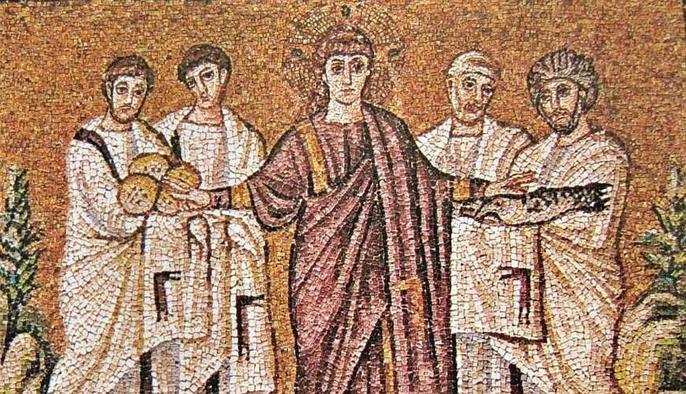 Din pericopa evanghelică aflăm că Hristos S-a întâlnit cu mulţime de oameni şi, fiindcă El era Doctorul celor bolnavi, I S-a făcut milă şi i-a vindecat pe bolnavii din acea mulţime. Făcându-se seară şi apropiindu-se noaptea, ucenicii Domnului I-au zis lui Hristos să dea drumul mulţimilor să meargă prin sate să îşi cumpere mâncare. Iisus le-a poruncit ucenicilor să le dea ei să mănânce mulţimilor, iar aceia au spus că au doar cinci pâini şi doi peşti, fapt ce ne înfăţişează cât de puţin ţineau ei la hrana trupească, negrijindu-se de cele materiale. Hristos a cerut să Îi fie aduse cele cinci pâini şi cei doi peşti, iar mulţimilor le-a poruncit să se aşeze pe iarba din acel ţinut şi, luând pâinile şi peştii şi „privind la cer - a vrut să arate că este de la Tatăl şi egal cu Tatăl, după cum zice Sfântul Ioan Gură de Aur -, a binecuvântat şi, frângând, a dat ucenicilor pâinile, iar ucenicii, mulţimilor”. Abia atunci se împlineau cuvintele Mântuitorului: „Daţi-le voi să mănânce...”, iar oamenii primeau hrana din mâna Apostolilor.