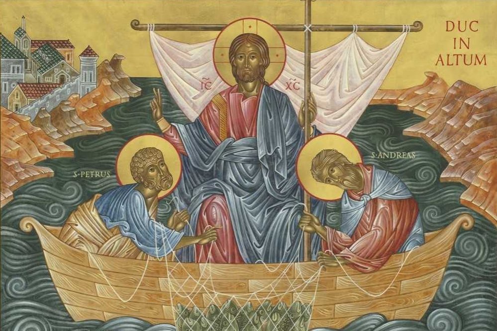 În vremea aceea Iisus şedea lângă lacul Ghenizaret şi a văzut două corăbii oprite lângă ţărm, iar pescarii, coborând din ele, spălau mrejele. Atunci El, urcându-Se într-una din corăbii, care era a lui Simon, l-a rugat s-o depărteze puţin de la uscat şi, şezând în corabie, învăţa din ea mulţimile. Iar când a încetat să vorbească, i-a zis lui Simon: Îndepărteaz-o la adânc şi lăsaţi în jos mrejele voastre ca să pescuiţi. Şi, răspunzând, Simon a zis: Învăţătorule, toată noaptea ne-am trudit şi nimic n-am prins, dar, după cuvântul Tău, voi arunca mrejele. Şi, făcând ei aceasta, au prins mulţime mare de peşte, încât li se rupeau mrejele. De aceea, au făcut semn celor care erau în cealaltă corabie să vină să-i ajute. Şi au venit şi au umplut amândouă corăbiile, încât erau gata să se scufunde. Iar Simon-Petru, văzând aceasta, a căzut în genunchi, înaintea lui Iisus, zicând: Ieşi de la mine, Doamne, că sunt om păcătos! Căci spaimă îi cuprinsese, pe el şi pe toţi cei ce erau cu el, pentru pescuirea atâtor peşti. Tot aşa şi pe Iacov şi pe Ioan, fiii lui Zevedeu, care erau împreună cu Simon. Şi a zis Iisus către Simon: Nu te teme; de acum înainte vei fi pescar de oameni. Şi, trăgând corăbiile la ţărm, au lăsat totul şi au mers după El.