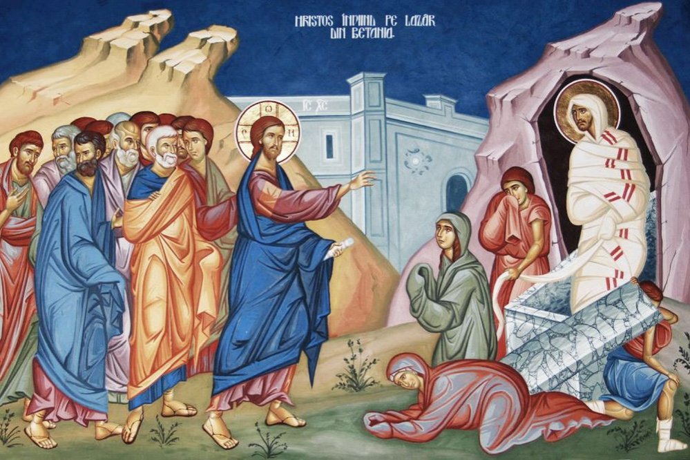 „În vremea aceea era bolnav un oarecare Lazăr din Betania, satul Mariei și al Martei, sora ei. Maria era aceea care a uns cu mir pe Domnul și I-a șters picioarele cu părul capului ei, iar fratele ei, Lazăr, era bolnav. Deci au trimis surorile la El, zicând: Doamne, iată, cel pe care îl iubești este bolnav. Iar Iisus, auzind, a zis: Această boală nu este spre moarte, ci pentru slava lui Dumnezeu, ca prin ea Fiul lui Dumnezeu să Se slăvească. Și iubea Iisus pe Marta și pe sora ei și pe Lazăr. Când a auzit, deci, că Lazăr este bolnav, Iisus a rămas două zile în locul în care era. Apoi a zis ucenicilor: Să mergem iarăși în Iudeea. Ucenicii I-au zis: Învățătorule, acum căutau iudeii să Te ucidă cu pietre, iar Tu iarăși Te duci acolo? A răspuns Iisus: Nu sunt oare douăsprezece ceasuri într-o zi? Dacă umblă cineva ziua, nu se împiedică, pentru că el vede lumina acestei lumi; iar dacă umblă cineva noaptea, se împiedică, pentru că lumina nu este în el. A zis acestea, iar după aceea le-a spus: Lazăr, prietenul nostru, a adormit; Mă duc să-l trezesc. Deci I-au zis ucenicii: Doamne, dacă a adormit, se va face bine. Iar Iisus vorbise despre moartea lui, iar ei credeau că vorbește despre somn ca odihnă. Însă atunci Iisus le-a spus lor pe față: Lazăr a murit. Și Mă bucur pentru voi, ca să credeți, că n-am fost acolo. Deci, să mergem la el. Însă Toma, care se numește Geamănul, a zis celorlalți ucenici: Să mergem și noi și să murim cu El. Deci, venind, Iisus l-a găsit (pe Lazăr) pus de patru zile în mormânt. Iar Betania era aproape de Ierusalim, ca la cincisprezece stadii. Și mulți dintre iudei veniseră la Marta și Maria, ca să le mângâie pentru fratele lor. Deci Marta, când a auzit că vine Iisus, a ieșit în întâmpinarea Lui, iar Maria ședea în casă. Și a zis Marta către Iisus: Doamne, dacă ai fi fost aici, fratele meu n-ar fi murit. Dar și acum știu că oricâte vei cere de la Dumnezeu, Dumnezeu Îți va da. Iisus i-a zis: Fratele tău va învia. Marta I-a zis: Știu că va învia la înviere, în ziua cea de apoi. Și Iisus i-a zis: Eu sunt Învierea și Viața; cel ce crede în Mine, chiar dacă va muri, va trăi. Și oricine trăiește și crede în Mine nu va muri în veac. Crezi tu aceasta? Zis-a Lui: Da, Doamne. Eu am crezut că Tu ești Hristos, Fiul lui Dumnezeu, Care a venit în lume. Și zicând aceasta, s-a dus și a chemat pe Maria, sora ei, zicându-i în taină: Învățătorul este aici și te cheamă. Când a auzit aceea, s-a ridicat degrabă și a venit la El. Și Iisus nu venise încă în sat, ci era în locul unde Îl întâmpinase Marta. Iar iudeii care erau cu ea în casă și îi spuneau cuvinte de mângâiere, văzând pe Maria că s-a ridicat degrabă și a ieșit din casă, au mers după ea, socotind că a plecat la mormânt ca să plângă acolo. Deci Maria, când a venit unde era Iisus, văzându-L, a căzut la picioarele Lui, zicându-I: Doamne, dacă ai fi fost aici, fratele meu n-ar fi murit. Deci Iisus, când a văzut-o plângând și pe iudeii care veniseră cu ea plângând și ei, a suspinat cu duhul și S-a tulburat întru Sine. Și a zis: Unde l-ați pus? Zis-au Lui: Doamne, vino și vezi. Și a lăcrimat Iisus. Deci ziceau iudeii: Iată, cât de mult îl iubea. Iar unii dintre ei ziceau: Nu putea oare Acesta, Care a deschis ochii orbului, să facă așa ca și acesta să nu moară? Deci, suspinând iarăși Iisus întru Sine, a mers la mormânt. Și era o peșteră și o piatră era așezată pe ea. Iisus a zis: Ridicați piatra! Marta, sora celui răposat, I-a zis: Doamne, deja miroase, că este a patra zi. Iisus i-a zis: Nu ți-am spus că, dacă vei crede, vei vedea slava lui Dumnezeu? Au ridicat deci piatra, iar Iisus Și-a ridicat ochii în sus și a zis: Părinte, Îți mulțumesc că M-ai ascultat. Eu știam că întotdeauna Mă asculți, dar pentru mulțimea care stă împrejur am zis, ca să creadă că Tu M-ai trimis. Și zicând acestea, a strigat cu glas mare: Lazăre, vino afară! Și a ieșit mortul, fiind legat la picioare și la mâini cu fâșii de pânză, iar fața lui era înfășurată cu mahramă. Iisus le-a zis: Dezlegați-l și lăsați-l să meargă. Deci, mulți dintre iudeii care veniseră la Maria și care văzuseră ce a făcut Iisus, au crezut în El."