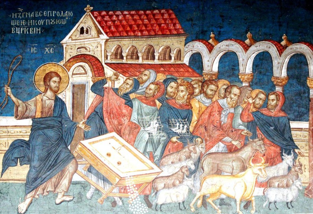 „În vremea aceea au coborât în Capernaum Iisus și Mama Sa și frații și ucenicii Săi, și acolo n-au rămas decât puține zile. Și erau aproape Paștile iudeilor și Iisus S-a suit la Ierusalim. Și a găsit șezând în templu pe cei ce vindeau boi și oi și porumbei și pe schimbătorii de bani. Și, făcându-Și un bici de ștreanguri, i-a scos pe toți afară din templu, și oile și boii, și schimbătorilor le-a vărsat banii și le-a răsturnat mesele. Și celor ce vindeau porumbei le-a zis: Luați acestea de aici și nu faceți casa Tatălui Meu casă de negustorie. Atunci și-au adus aminte ucenicii Lui că este scris: «Râvna casei Tale mă mistuie». Au răspuns, deci, iudeii și I-au zis: Ce semn ne arăți că faci acestea? Iisus a răspuns și le-a zis: Dărâmați templul acesta și în trei zile îl voi ridica. Dar iudeii au răspuns: În patruzeci și șase de ani s-a zidit templul acesta, și Tu îl vei ridica în trei zile? Dar El vorbea despre templul trupului Său. De aceea, când a înviat din morți, ucenicii Lui și-au adus aminte că aceasta o spusese și au crezut Scripturii și cuvântului rostit de Iisus.”