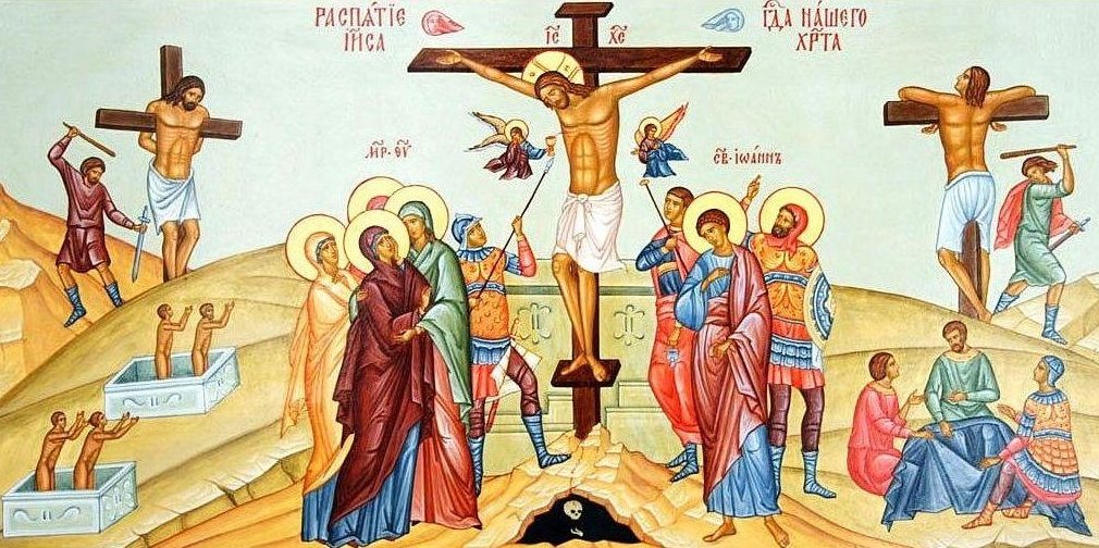 „În vremea aceea arhiereii, cărturarii și bătrânii poporului L-au dus pe Iisus înaintea lui Pilat. Și au început să-L învinuiască, zicând: Pe Acesta am găsit răzvrătind neamul nostru și împiedicând să dăm dajdie cezarului și zicând că El este Hristos Împăratul. Iar Pilat L-a întrebat, zicând: Tu ești Împăratul iudeilor? Iar El, răspunzând, a zis: Tu zici. Și Pilat a zis către arhierei și către mulțimi: Nu găsesc nici o vină în Omul acesta. Dar ei stăruiau, zicând că întărâtă poporul, învățând prin toată Iudeea, începând din Galileea până aici. Iar Pilat, auzind, a întrebat dacă omul este galileean. Și, aflând că este de sub stăpânirea lui Irod, L-a trimis la Irod, care era și el în Ierusalim în acele zile. Iar Irod, văzând pe Iisus, s-a bucurat foarte mult, fiindcă de multă vreme dorea să-L cunoască, pentru că auzise despre El și nădăjduia să vadă vreo minune săvârșită de El. Și L-a întrebat Irod multe lucruri, dar El nu i-a răspuns nimic. Iar arhiereii și cărturarii erau de față, învinuindu-L foarte tare. Însă Irod, împreună cu ostașii săi, batjocorindu-L și luându-L în râs, L-a îmbrăcat cu o haină strălucitoare și L-a trimis iarăși la Pilat. Și, în ziua aceea, Irod și Pilat s-au făcut prieteni unul cu altul, pentru că mai înainte era dușmănie între ei. Iar Pilat, chemând pe arhierei și pe căpetenii și toată mulțimea, a zis către ei: Ați adus la mine pe Omul acesta ca pe un răzvrătitor al poporului; dar iată eu, cercetându-L în fața voastră, nici o vină n-am găsit în acest Om din cele ce aduceți împotriva Lui. Și nici Irod n-a găsit, căci L-a trimis iarăși la noi. Și iată, El n-a săvârșit nimic vrednic de moarte. Deci, pedepsindu-L, Îl voi elibera. Și trebuia, în ziua praznicului, să le elibereze un vinovat. Dar ei, cu toții, au strigat, zicând: Ia-L pe Acesta și eliberează-ne pe Baraba, care era aruncat în temniță pentru o răscoală făcută în cetate și pentru omor. Și iarăși le-a vorbit Pilat, voind să le elibereze pe Iisus. Dar ei strigau, zicând: Răstignește-L! Răstignește-L! Atunci el a zis a treia oară către ei: Ce rău a săvârșit Acesta? Nici o vină de moarte nu am aflat întru El. Deci, pedepsindu-L, Îl voi elibera. Dar ei stăruiau, cerând cu strigăte mari ca El să fie răstignit, iar strigătele lor au biruit. Deci Pilat a hotărât să se împlinească cererea lor. Și le-a eliberat pe cel aruncat în temniță pentru răscoală și ucidere, pe care îl cereau ei, iar pe Iisus L-a dat în voia lor. Și, pe când Îl duceau, oprind pe un oarecare Simon Cirineul, care venea din țarină, i-au pus crucea ca s-o ducă în urma lui Iisus. Iar după El venea mulțime multă de popor și de femei, care se băteau în piept și Îl plângeau. Dar, întorcându-Se către ele, Iisus le-a zis: Fiice ale Ierusalimului, nu Mă plângeți pe Mine, ci pe voi plângeți-vă și pe copiii voștri! Căci iată, vin zile în care vor zice: Fericite sunt cele sterpe și pântecele care n-au născut și sânii care n-au alăptat! Atunci vor începe să spună munților: Cădeți peste noi! și dealurilor: Acoperiți-ne! Căci dacă fac acestea cu lemnul verde, cu cel uscat ce va fi? Și erau duși și alți doi făcători de rele, ca să-i omoare împreună cu El. Iar când au ajuns la locul ce se cheamă «al Căpățânii», L-au răstignit acolo pe El și pe făcătorii de rele, unul de-a dreapta și altul de-a stânga. Iar Iisus zicea: Părinte, iartă-le lor, că nu știu ce fac! Și, împărțind hainele Lui, au aruncat sorți. Era acum ca la ceasul al șaselea și întuneric s-a făcut peste tot pământul până la ceasul al nouălea, când soarele s-a întunecat, iar catapeteasma templului s-a sfâșiat pe mijloc. Atunci Iisus, strigând cu glas mare, a zis: Părinte, în mâinile Tale încredințez duhul Meu! Și, aceasta zicând, Și-a dat duhul. Iar sutașul, văzând cele ce s-au făcut, a slăvit pe Dumnezeu, zicând: Cu adevărat, Omul Acesta drept a fost. Și toate mulțimile care veniseră la această priveliște, văzând cele întâmplate, se întorceau bătându-și pieptul. Iar toți cunoscuții Lui și femeile care Îl însoțiseră din Galileea stăteau departe, privind acestea. Și, iată, un bărbat cu numele Iosif, din Arimateea, cetate a iudeilor, sfetnic fiind, care era bărbat bun și drept, care nu se învoise cu sfatul și cu fapta lor și care aștepta Împărăția lui Dumnezeu, venind la Pilat, a cerut trupul lui Iisus. Și coborându-L, L-a înfășurat în giulgiu de in și L-a pus într-un mormânt săpat în piatră, în care nimeni, niciodată, nu mai fusese pus. Iar ziua aceea era vineri și se lumina spre sâmbătă. Și, urmându-I femeile care veniseră cu El din Galileea, au privit mormântul și cum a fost pus trupul Lui. Și, întorcându-se, au pregătit miresme și miruri; iar sâmbătă s-au odihnit, după porunca legii.”