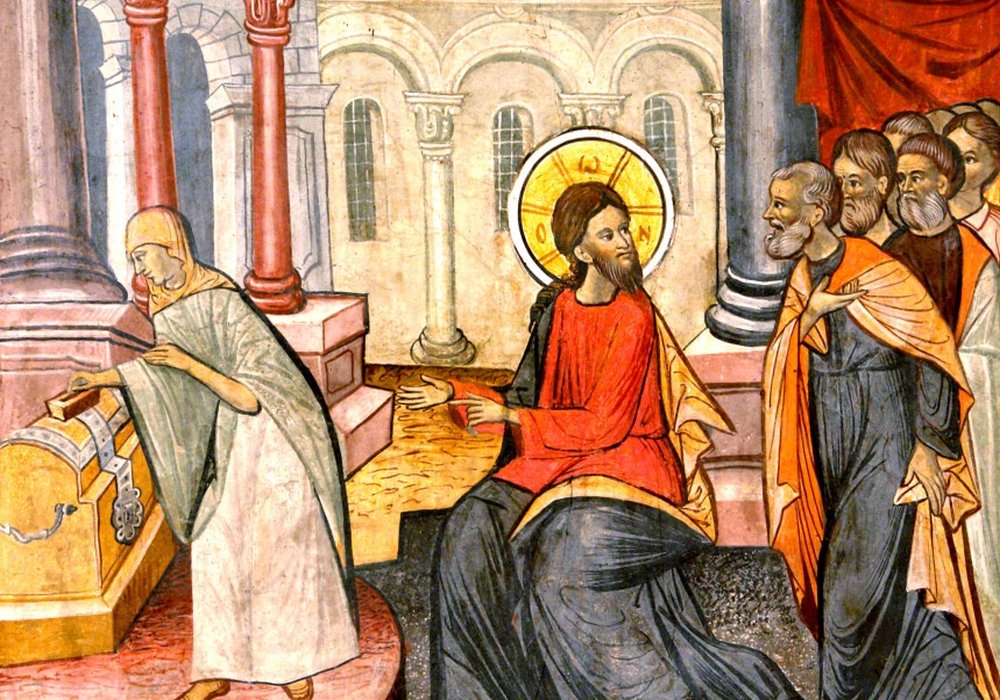 „Zis-a Domnul: Păziți-vă de cărturarii cărora le place să se plimbe în haine lungi și să li se plece lumea în piețe și să stea în băncile dintâi în sinagogi și să stea în capul mesei la ospețe. Ei, care secătuiesc casele văduvelor și de ochii lumii se roagă îndelung, își vor lua mai multă osândă. Și, șezând în preajma cutiei darurilor, Iisus privea cum mulțimea aruncă bani în cutie. Și mulți bogați aruncau mult. Și venind o văduvă săracă, a aruncat doi bani, adică un codrant. Și chemând la Sine pe ucenicii Săi le-a zis: Adevărat grăiesc vouă că această văduvă săracă a aruncat în cutia darurilor mai mult decât toți ceilalți. Pentru că toți au aruncat din prisosul lor, pe când ea, din sărăcia ei, a aruncat tot ce avea, toată avuția sa.”