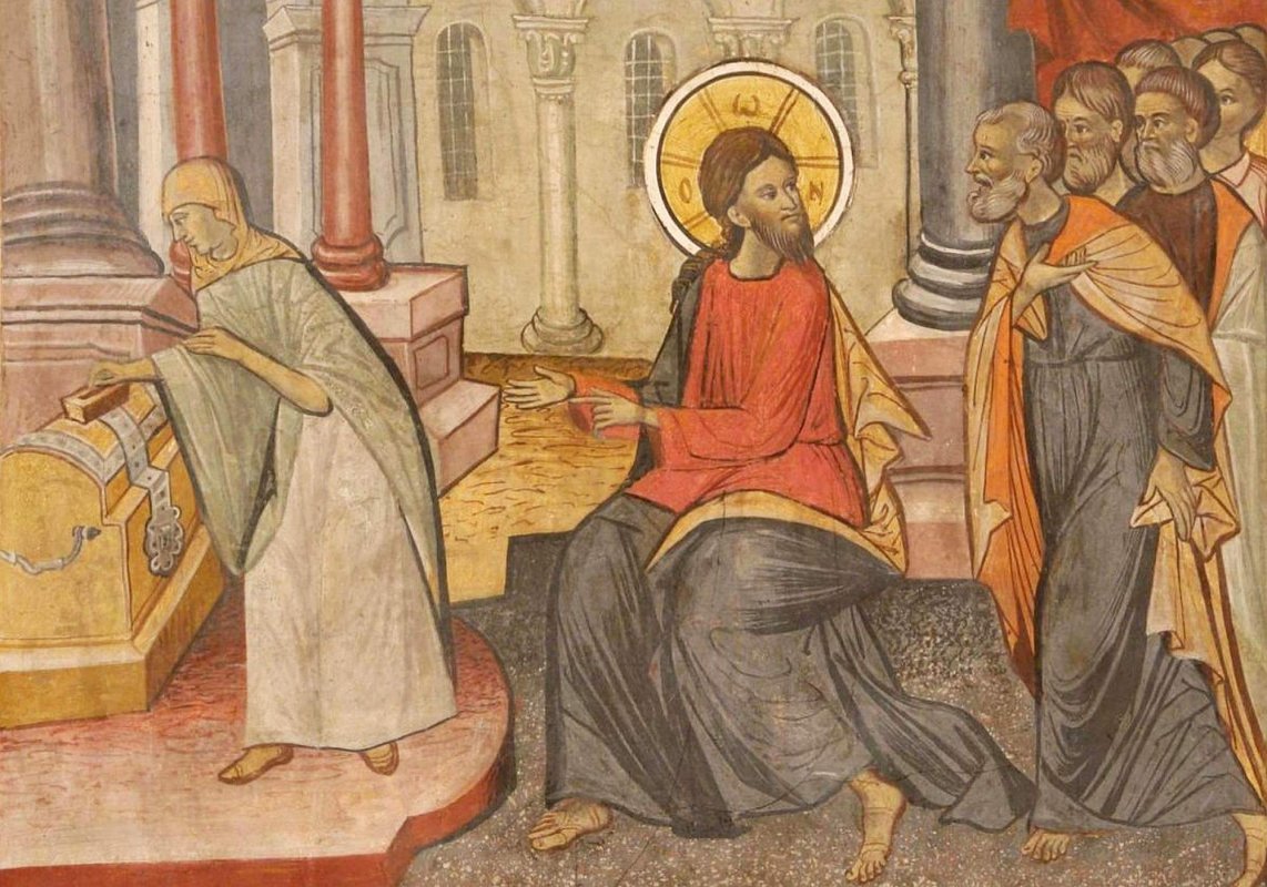 „Zis-a Domnul: Păziți-vă de cărturarii cărora le place să se plimbe în haine lungi și să li se plece lumea în piețe și să stea în băncile dintâi în sinagogi și să stea în capul mesei la ospețe. Ei, care secătuiesc casele văduvelor și de ochii lumii se roagă îndelung, își vor lua mai multă osândă. Și, șezând în preajma cutiei darurilor, Iisus privea cum mulțimea aruncă bani în cutie. Și mulți bogați aruncau mult. Și venind o văduvă săracă, a aruncat doi bani, adică un codrant. Și chemând la Sine pe ucenicii Săi le-a zis: Adevărat grăiesc vouă că această văduvă săracă a aruncat în cutia darurilor mai mult decât toți ceilalți. Pentru că toți au aruncat din prisosul lor, pe când ea, din sărăcia ei, a aruncat tot ce avea, toată avuția sa.”