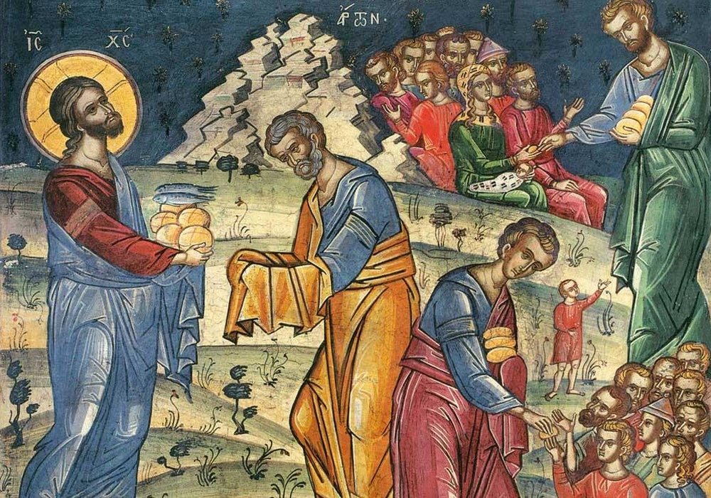 „În vremea aceea s-au adunat apostolii la Iisus și I-au spus toate câte au făcut și au învățat. Atunci El le-a zis: Veniți voi înșivă de o parte, în loc pustiu, și odihniți-vă puțin. Căci mulți erau care veneau și mulți care se duceau și nu mai aveau vreme nici să mănânce. Și au plecat cu corabia spre un loc pustiu, deosebi. Dar i-au văzut plecând, și mulți au înțeles și au alergat acolo pe jos de prin toate cetățile și au sosit înaintea lor. Deci, ieșind din corabie, Iisus a văzut mulțime mare și I s-a făcut milă de ei, căci erau ca niște oi fără păstor, și a început să-i învețe multe. Dar, făcându-se târziu, ucenicii Lui, apropiindu-se, I-au zis: Locul e pustiu și ceasul e târziu; dă-le drumul ca, mergând prin cetățile și prin satele dimprejur, să-și cumpere pâine, că nu au ce să mănânce. Răspunzând, El le-a zis: Dați-le voi să mănânce. Și ei I-au zis: Să mergem noi să cumpărăm pâini de două sute de dinari și să le dăm să mănânce? Iar El le-a zis: Câte pâini aveți? Duceți-vă și vedeți. Și aflând, I-au spus: Cinci pâini și doi pești. Atunci El le-a poruncit să-i așeze pe toți, în cete, pe iarba verde. Și au șezut cete-cete, câte o sută și câte cincizeci. Iar El, luând cele cinci pâini și cei doi pești, privind la cer, a binecuvântat și a frânt pâinile și le-a dat ucenicilor ca să le pună înaintea lor; asemenea și cei doi pești i-a împărțit tuturor. Și au mâncat toți și s-au săturat. Și au luat douăsprezece coșuri pline cu fărâmituri și cu ce a rămas din pești. Iar cei ce au mâncat pâinile erau cinci mii de bărbați. După aceea, îndată a silit pe ucenicii Lui să intre în corabie și să meargă înaintea Lui, de cealaltă parte, spre Betsaida, până ce El va da drumul mulțimii.”