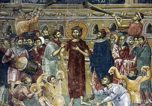 „În vremea aceea a intrat Iisus în templu și i-a alungat pe toți cei ce vindeau și cumpărau în templu și a răsturnat mesele schimbătorilor de bani și scaunele celor care vindeau porumbei. Și a zis lor: