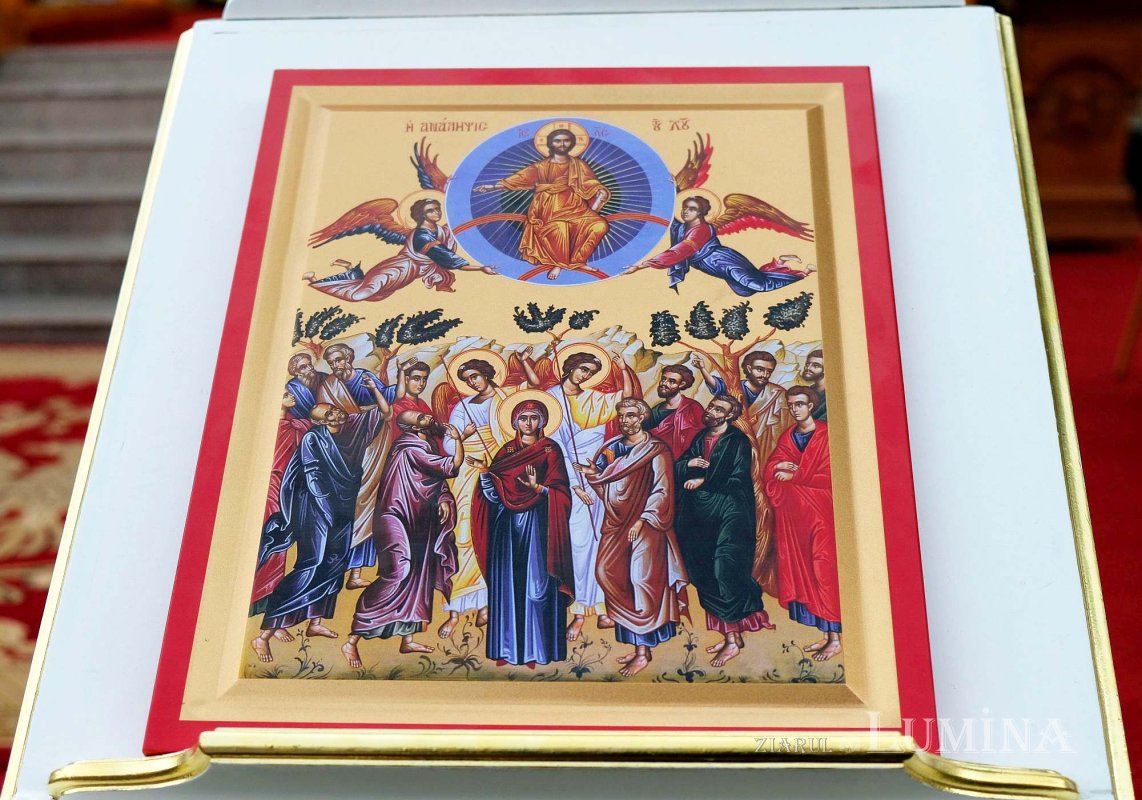 Un nor izvorâtor din Dumnezeu a luminat foarte Înălţarea Ta, Dătătorule de viaţă, Doamne, pe care l-au văzut ucenicii, când, despărţindu-Te de dânşii, i-ai binecuvântat şi, astfel, cu Slavă multă, purtat pe aripile Heruvimilor, ai săvârşit Înălţarea, care mai înainte era de nepătruns din pricina duhurilor răutăţii de sub ceruri şi a stăpânitorilor puterilor văzduhului. Acum însă, Tu, primit acolo, ca toată făptura văzută şi nevăzută să-Ţi cânte cântarea îngerească: Aliluia!