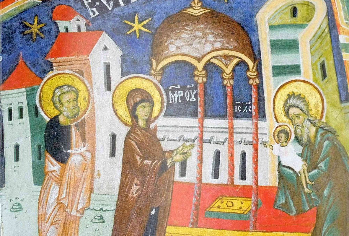 Biserica Ortodoxă sărbătoreşte astăzi Întâmpinarea Domnului, adică aducerea la templul din Ierusalim a Pruncului Iisus, la 40 de zile de la Naşterea Sa, de către Sfânta Fecioară Maria şi Dreptul Iosif. Aici este întâmpinat de Dreptul Simeon şi prorociţa Ana. Bătrânul Simeon, mişcat de Duhul Sfânt, a venit la templu, unde i s-a împlinit, înainte de moarte, aşteptarea de a-L vedea pe Mesia, precum i se făgăduise. Iar în Pruncul Cel adus la templu, el a văzut cu ochi prorocesc mântuirea pe care Dumnezeu a dăruit-o lumii, prin Hristos, Cel plin de lumina harului, mai presus decât toată puterea Legii vechi. Bucuros de această descoperire, bătrânul Simeon a venit întru întâmpinarea Pruncului Iisus şi, luându-L în braţe, plin de recunoştinţă, a rostit cuvintele: „Acum, slobozeşte pe robul Tău, Stăpâne, după cuvântul Tău, în pace, că ochii mei văzură mântuirea Ta, pe care ai gătit-o înaintea feţei tuturor popoarelor, lumină spre descoperirea neamurilor şi slavă poporului Tău Israel” (Luca 2, 29-32). Astăzi, prin glasul Dreptului Simeon, „se întâlnesc, în templu, Legea veche a slovei cu Legea cea nouă a Duhului Sfânt. Şi Mântuitorul împlineşte porunca Legii vechi, în numele nostru al tuturor, ca să ne facă pe toţi liberi faţă de Legea veche, dar totodată ne cheamă şi să primim Legea cea nouă, puterea de mântuire a credinţei în El, mai tare decât Legea veche, puterea de mântuire a tuturor popoarelor lumii. Această veste bună este darul cel mai de preţ al întâmpinării Domnului, de astăzi, de către Dreptul Simeon la templu” (Proloagele). Tot în templu se afla şi „Ana prorociţa, fiica lui Fanuel, din seminţia lui Aşer, ajunsă la adânci bătrâneţe şi care trăise cu bărbatul ei şapte ani de la fecioria sa. Şi ea era văduvă, în vârstă de optzeci şi patru de ani, şi nu se depărta de templu, slujind noaptea şi ziua în post şi în rugăciuni. Şi venind ea în acel ceas, lăuda pe Dumnezeu şi vorbea despre Prunc tuturor celor ce aşteptau mântuire în Ierusalim” (Luca 2, 36-38). Aceşti doi oameni drepţi sunt cei care mărturisesc mesianitatea Pruncului Iisus, adus la templul din Ierusalim la 40 de zile de la Naşterea Sa.