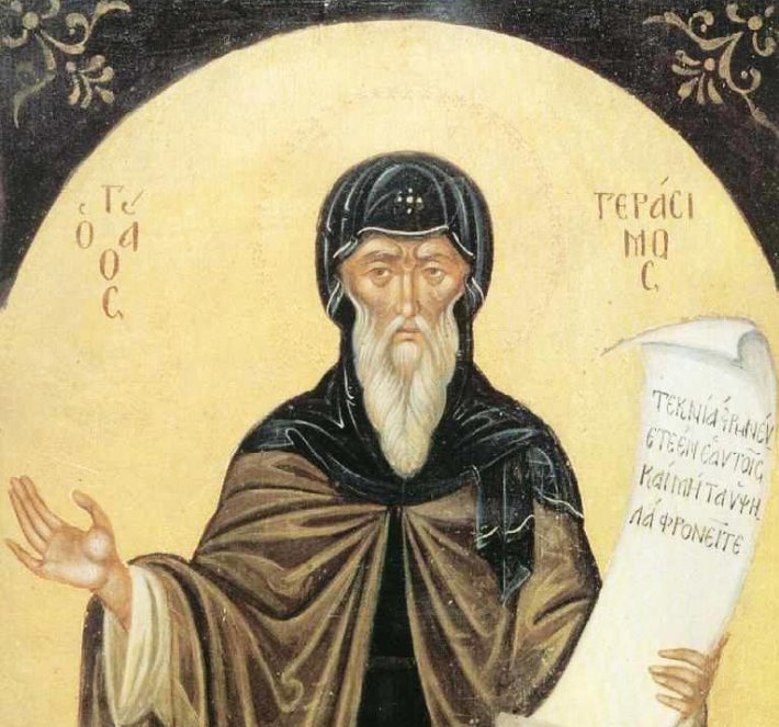 Sfântul Gherasim din Chefalonia s-a născut în satul Trikkala din Peloponez. S-a călugărit pe insula Zakynthos, după care a plecat la Muntele Athos. Primind binecuvântare de la părinţi, s-a dus la Ierusalim să se închine la Sfântul Mormânt al Mântuitorului, iar acolo s-a îngrijit de candelele Sfântului Mormânt. A fost hirotonit diacon şi apoi preot de către Patriarhul Gherman al Ierusalimului (1534-1579). Pentru singurătate s-a retras la Iordan, unde s-a nevoit 40 de zile, apoi în Zakynthos, unde s-a hrănit numai cu ierburi. După cinci ani, a simţit dorinţa de a pleca pe insula Chefalonia, unde şi-a găsit adăpost într-o peşteră. Pentru viaţa lui curată, Sfântul Gherasim s-a învrednicit de darul vindecării bolnavilor şi al izgonirii duhurilor necurate. Pe când avea 71 de ani, sfântul a ştiut că va muri curând. A trecut în pace la Domnul în anul 1579. După doi ani, deschizându-i-se mormântul, s-au descoperit moaştele sale întregi şi frumos mirositoare, vindecătoare de boli.