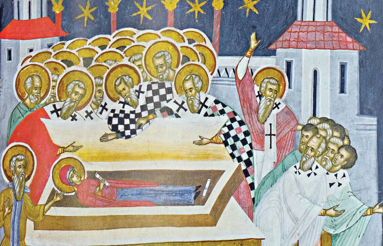 Atunci, Sfinţii Părinţi ai Bisericii au zis ereticilor să îşi scrie într-o carte mărturisirea lor de credinţă, care urma să fie pusă în racla Sfintei Muceniţe Eufimia, alături de mărturisirea de credinţă a dreptcredincioşilor. Şi pecetluind racla cu pecete împărătească, au pus păzitori, iar după trei zile de post şi rugăciune, deschizând racla au găsit scrierea Sfinţilor Părinţi în mâna dreaptă a sfintei, iar pe aceea a ereticilor la picioarele ei. Sfânta Eufimia s-a născut la Calcedon în ţinutul Bitiniei şi a primit cununa muceniciei în anul 307. Era o tânără fecioară care îşi închinase viaţa Mântuitorului Iisus Hristos.