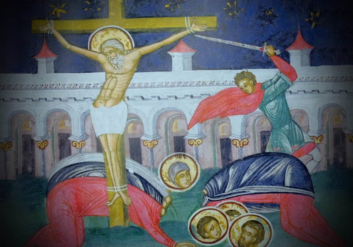 Și era acolo de față și Sfânta Paula fecioara, care purtase de grijă de rănile sfinților, iar, după moartea acestora, de moaștele lor. Deci, fiind și ea prinsă, a fost adusă în faţa judecătorilor şi, nevrând să jertfească idolilor, a fost bătută crunt cu nuiele.